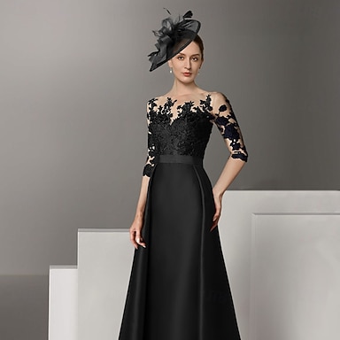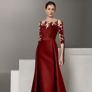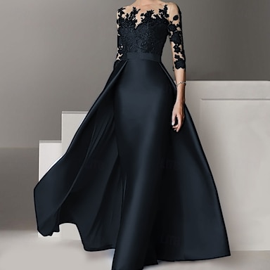 Corte A Corte Trompeta Sirena Hasta el Suelo Vestidos de noche Vestido de baile con sobrefalda Vestimenta formal Elegante Manga 3/4 Cuello Barco Fiesta de jardin Boda Satén elástico con Flores 3D