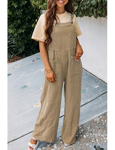 Overol normal activo de lino similar a algodón falso para mujer color sólido sin mangas piernas anchas cuello cuadrado bolsillo diario vacaciones ajuste holgado rojo azul marino caqui verano