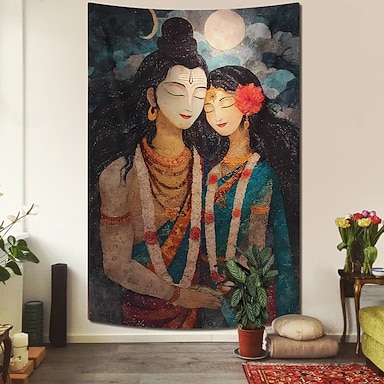 Tapiz de pared de amor divino Shiva Parvati, pintura del dios hindú Lord Shiva y la diosa Parvati con luna llena y cielo estrellado para estudio de yoga, sala de meditación, decoración de dormitorio,