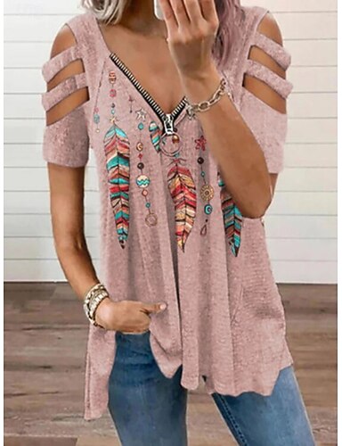 Mujer camisa boho Blusa Retazos Cremallera Estampado Graphic Hojas Elegante Moderno Casual Manga Corta Escote en Pico Tops regulares Diario Festivos Noche Azul Piscina Negro Rosa Azul cielo Morado