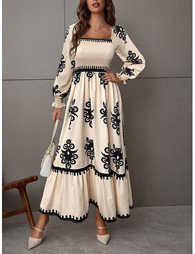 Mujer Vestido maxi Vestido de una línea Vestido de flores Elegante Moda Moderno Exterior Vacaciones Fiesta Ajuste regular Floral Manga Larga Escote Cuadrado Negro Burdeos Marrón Albaricoque Primavera