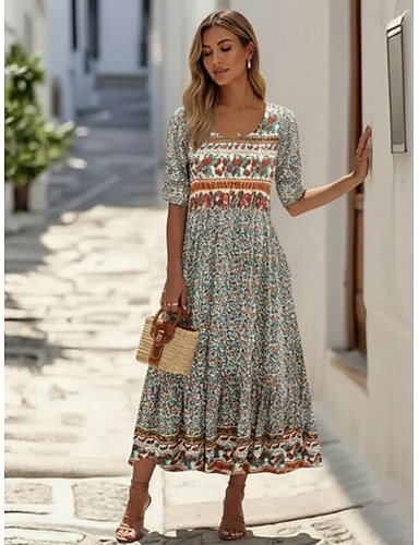 Mujer Vestido Kaftan Vestido Estampado Vestido a media pierna Vestido Midi Azul Piscina Mangas medias Flor / Plantas Estampado Primavera verano Escote en Pico Estilo playero Playa XS S M