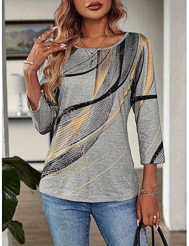 Mujer Camiseta superior Geométrico Abstracto Casual Boho Manga Larga Escote Redondo Tops regulares Noche Fin de semana Ropa de vacaciones Azul Piscina Dorado Gris Primavera, Otoño, Invierno, Verano