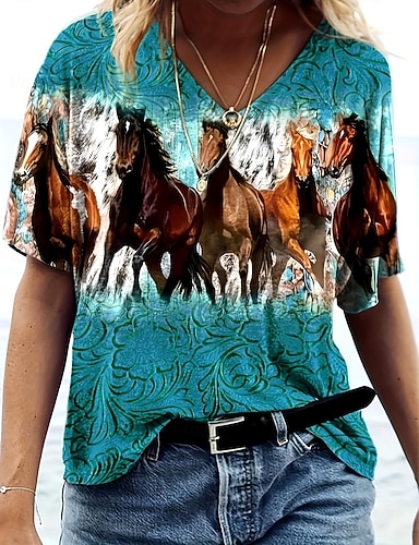 Camiseta de mujer casual con estampado de caballos, manga corta, cuello en V, para uso diario, azul, morado, verde, verano