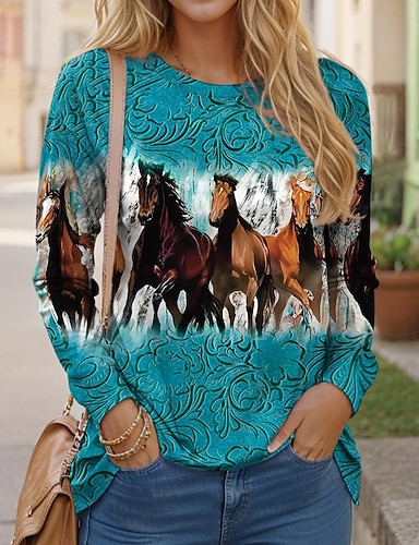 Camiseta de mujer de manga larga cuello redondo túnica estampado de caballo casual tops regulares diarios azul primavera otoño preotoño