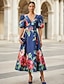 Corte A Vestido Midi Vestidos de coctel Elegante Vintage Floral Manga Corta Escote en Pico Fiesta de jardin Boda Bolsillo Satén con Estampado flor Plisado