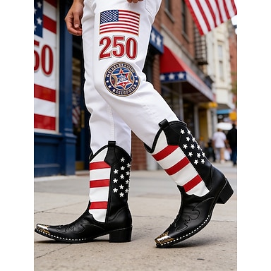 Botas vaqueras con la bandera estadounidense para hombre, conmemorativas del 250.º aniversario de Estados Unidos: cuero genuino, diseño patriótico, cómodas y elegantes, ideales para el 4 de julio, el Día de la Independencia, festivales de música y ropa in