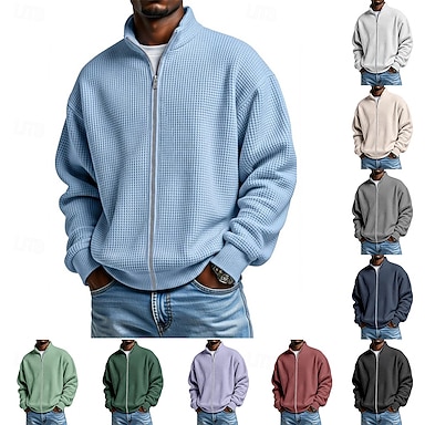 Hombre Sudadera Sudadera con estampado de gofres Sudadera Con Capucha Pull-over Sudadera con cremallera completa Albaricoque Negro Blanco Verde Claro Verde Ejército Cuello Mao Plano Con Texturas