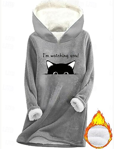 Mujer Sudadera con capucha Pullover Estampado Forrado con Lana Graphic Gato Cálido Casual Forro polar de sherpa Manga Larga Con Capucha Tops largos Casual Calle Uso Diario Azul Piscina Gris Oscuro