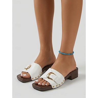 Sandalias blancas elegantes para mujer: modernas sandalias de punta cuadrada con hebilla dorada grande. &suela de madera para vacaciones de verano en la playa, vacaciones en la isla &ropa de playa