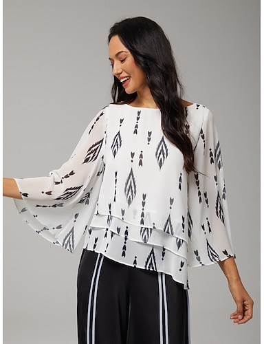 Blusa de mujer con cuello redondo, tejido de gasa texturizado y mangas tres cuartos acampanadas, dobladillo en capas, elegante, para fiestas, vacaciones, informal, para uso diario, primavera y otoño.