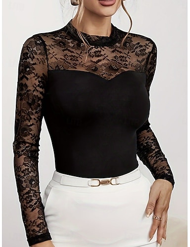 Mujer Top de empalme de encaje Blusa Encaje Retazos Plano Elegante Sensual Clásico Manga Larga Cuello Alto Tops regulares Diario Festivos Noche Negro Verano Primavera
