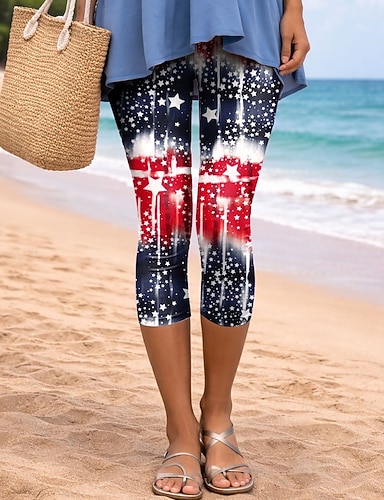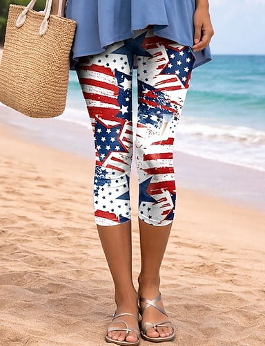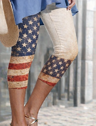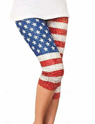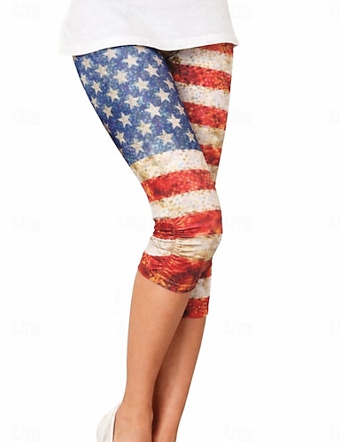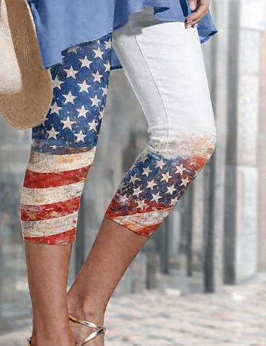 Leggings chinos para mujer, diseño del Día de la Independencia de Estados Unidos, para vacaciones, moda urbana, pantalones de cintura alta hasta la rodilla, con la bandera estadounidense, cómodos, suaves y elásticos, para uso diario, para exteriores, vaca