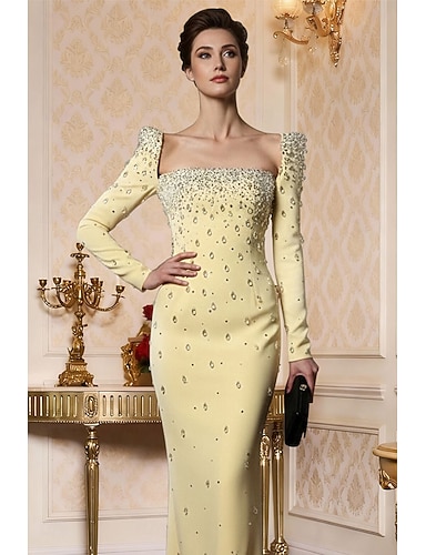 Vestido de gala tipo columna o vaina largo hasta el suelo elegante de manga larga escote cuadrado fiesta de gala boda con cristales y pedrería