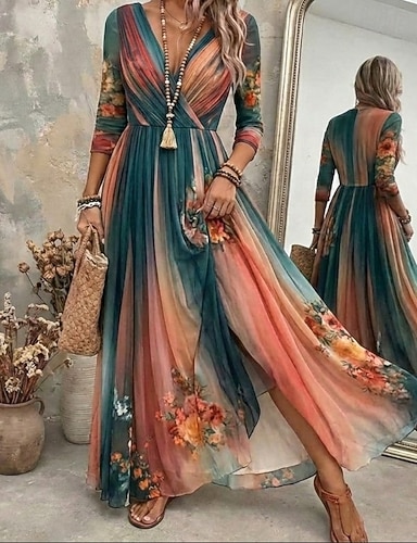 Mujer vestido largo vestido largo Vestido informal Vestido de Columpio Vestido de verano Vestido bohemio Vintage Vacaciones Diario Festivos Ajuste regular Floral Manga Larga Escote en Pico Verde