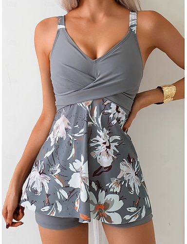 Mujer Bañadores Tankini 2 piezas Falda Traje de baño Control de barriga Alta cintura Delgado Espalda al Aire Vacaciones Ropa de playa Floral Graphic Escote en U Sin Mangas Trajes de baño