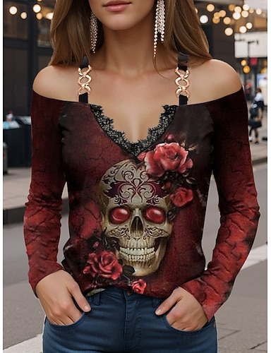 Blusa de mujer Floral Gráfica de Calaveras Calavera Vintage Estilizada Casual de Manga Larga Cuello en V Tops Regulares Impresión Diario Salir Patchwork Blanco Rojo Vino Púrpura Caqui Primavera Otoño