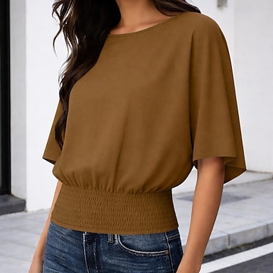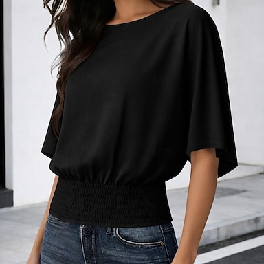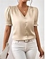 Mujer Camisa Blusa de satén Camisa para Vestido Color sólido Plano Elegante Moda Casual Manga Corta Cuello Barco Tops regulares Diario Ropa de calle Trabajo Negro Blanco Albaricoque Gris Verano