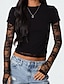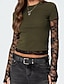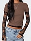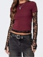 Mujer Camiseta Top de empalme de encaje Y2K Sayo Malla falso de dos piezas Elegante Sensual Casual Manga Larga Cuello Barco Tops cortos Diario Noche Negro Verde Ejército Rojo Marrón Verano Primavera
