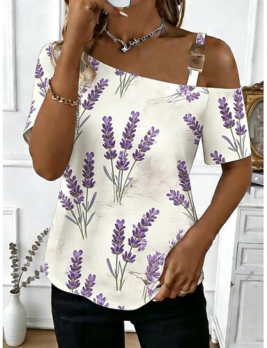 Mujer Camiseta Camiseta superior Estampado Floral Graphic Moda Elegante Clásico Manga Corta Cuello asimétrico Tops regulares Diario Noche Fin de semana Blanco Rosa Verde Trébol Verano Primavera
