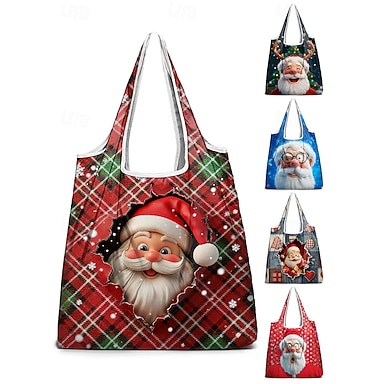 Bolsa de compras navideña plegable para mujer - varios diseños de Papá Noel, material de poliéster, resistente y compacta, perfecta para las compras navideñas y los regalos.