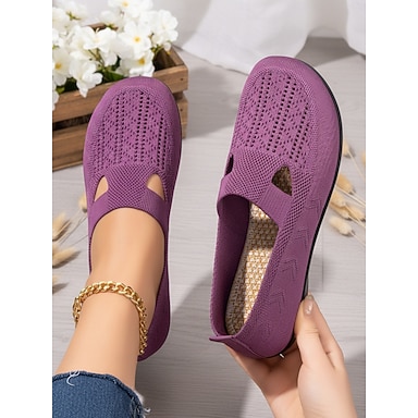 Zapatos planos de punto transpirables morados de corte ancho para mujer: zapatos ligeros y elásticos sin cordones, estilo informal minimalista para caminar, trabajar, viajar y comodidad diaria.