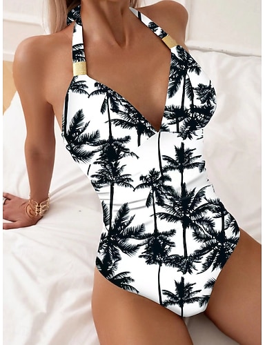Bañador de una pieza para mujeres monokini moldeador de palmeras braguitas control de abdomen alta cintura delgado espalda descubierta para vacaciones playa cuello halter sin mangas