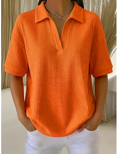 Mujer Camiseta Camisetas polo Tee Tops de punto gofre Plano Moda Elegante Básico Manga Corta Cuello Camisero Tops regulares Diario Noche Fin de semana Azul Piscina Negro Blanco Amarillo Naranja