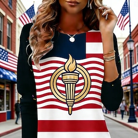 Independence Day Amerikkalainen Juhlapäivä Patriottinen Naisten T-paita Graafinen Lippu Lippu Muoti Tyylikäs Klassinen Pitkähiha Pyöreä Kaula Päivittäinen Viikonloppu Printti Sininen Musta Valkoinen