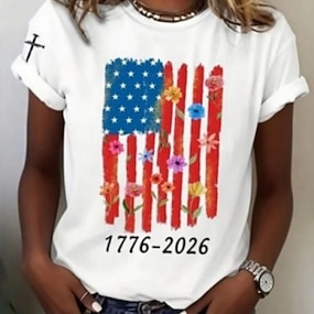 Amerikan itsenäisyyspäivä Naisten T-paita Painettu Kuvitettu Kirjain Amerikan lippu Tyylikäs Klassinen Vapaa-aika Lyhythihainen Tiukka pyöreä kaula-aukko Tavalliset topit Päivittäin Valkoinen Kes