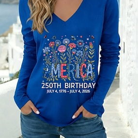 Amerikan itsenäisyyspäivä Naisten T-paita Painettu Kukka Amerikan lippu Tyylikäs Klassinen Vapaa-aika Pitkähihainen V kaula-aukko Tavalliset topit Päivittäin Bile Rubiini Laivaston sininen Khaki