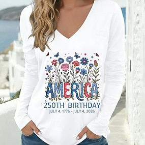 Naisten T-paita Painettu Kuvitettu Amerikan lippu Vintage Tyylikäs Klassinen Pitkähihainen V kaula-aukko Tavalliset topit Päivittäin Bile Viikonloppu Valkoinen Rubiini Laivaston sininen Khaki Kes