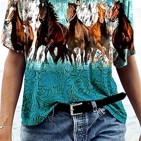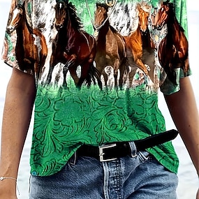 Naisten T-paita Painettu Kuvitettu Eläin Hevonen Vintage Tyylikäs Klassinen Lyhythihainen Tiukka pyöreä kaula-aukko Pyöreä kaula-aukko Tavalliset topit Päivittäin Viikonloppu Sininen Musta Valkoinen