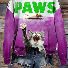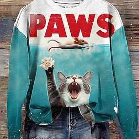 Naisten T-paita pyöreä pääntie pitkät hihat tunika kissa moderni rento säännölliset yläpaita päivittäinen viikonloppu printti valkoinen keltainen punainen sininen pölyinen sininen syksy talvi
