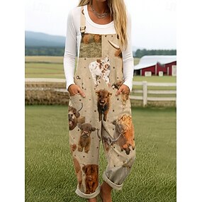Naisten 100% puuvillaiset haalarit aktiiviseen käyttöön eläinkuosilla ilman hihoja leveät lahkeet neliön muotoinen kaula-aukko tasku lomamatka päivittäinen löysä istuvuus valkoinen keltainen violetti