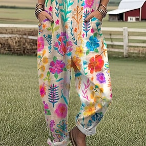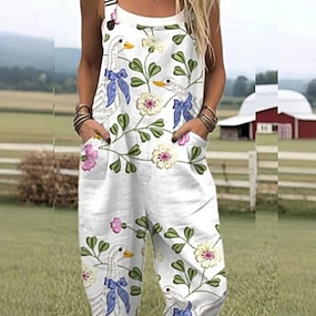 Naisten 100% puuvillaiset haalarit aktiiviseen käyttöön kukkakuosilla ilman hihoja suorat lahkeet neliön muotoinen kaula-aukko tasku lomamatka kaupunkikäyttö löysä istuvuus valkoinen keltainen