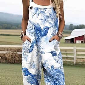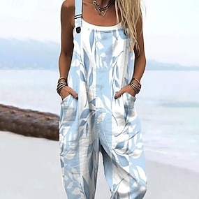 Naisten 100% puuvillaiset haalarit aktiiviseen käyttöön graafisella kuosisella ilman hihoja suorat lahkeet neliön muotoinen kaula-aukko tasku lomamatka päivittäinen löysä istuvuus valkoinen sininen