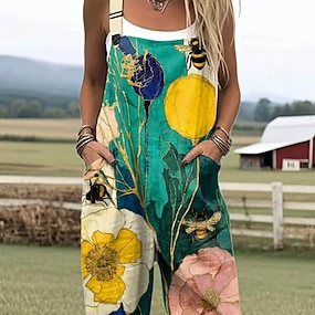 Naisten 100% puuvillaiset haalarit aktiiviseen käyttöön kukkakuosilla ilman hihoja suorat lahkeet neliön muotoinen kaula-aukko tasku lomamatka päivittäinen löysä istuvuus valkoinen keltainen sininen