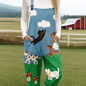 Naisten 100% puuvillaiset haalarit aktiiviseen käyttöön eläinkuosilla ilman hihoja leveät lahkeet neliön muotoinen kaula-aukko tasku lomamatka päivittäinen löysä istuvuus valkoinen keltainen violetti
