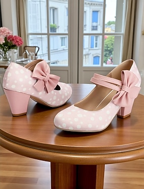 naisten vintage vaaleanpunaiset ja valkoiset korkokengät rusetilla - tyylikkäät retrokorkokengät häihin, juhliin ja erikoistilaisuuksiin