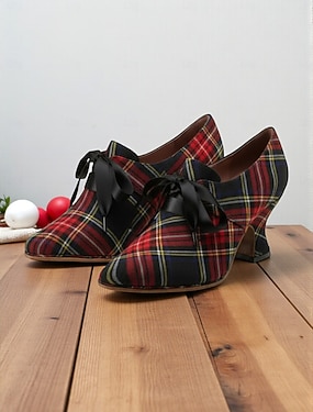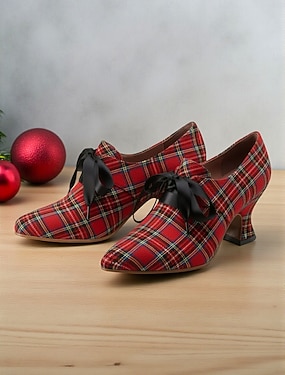 naisten punaiset tartaaniruudulliset teräväkärkiset korkokengät – tyylikkäät pumput toimistoon, juhliin ja juhlatilaisuuksiin