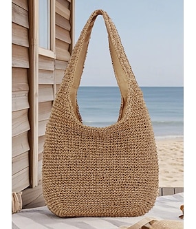 naisten käsintehty olkiolkalaukku – iso boho-rantalaukku kesämatkoille, lomalle ja arkiasuihin ruskea beige