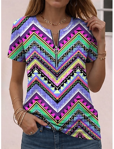 Naisten T-paita Vetoketju Kuvitettu Geometrinen Abstrakti Vintage Havaijilainen Tyylikäs Lyhythihainen Tiukka pyöreä kaula-aukko V kaula-aukko Tavalliset topit Päivittäin Urheilu Viikonloppu Purppura