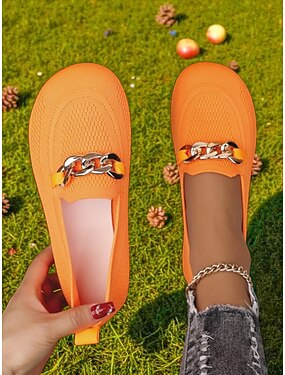 Naisten oranssit leveäkärkiset flyknit-slip-on-loaferit – mukavat ja hengittävät rennot ballerinat metalliketjuilla, jotka sopivat erinomaisesti ostoksille, töihin ja puutarhakävelyille.