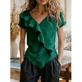 Naisten Kesä paita Rento paita Pusero Röyhelö Yhtenäinen väri Vintage Tyylikäs Lyhythihainen V kaula-aukko Tavalliset topit Päivittäin Pyhäpäivä Bile Sininen Musta Rubiini Vaalean ruskea Apila Kes