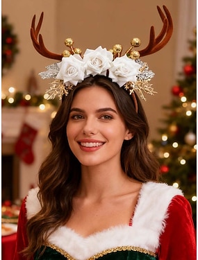 Naisten jouluinen poronsarvipantasetti (2 kpl), juhlavat kukkakuvioiset hiusasusteet punaisilla ja valkoisilla ruusuilla, kultaiset marjat &samettiset sarvet lomajuhliin &perhekuvia