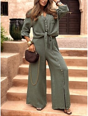 Naisten Housusarjat Pitkähihainen Paitapuserokaula-aukko Yhtenäinen väri Muoti Katutyyli Kausaliteetti Päivittäin ulko- Valkoinen Armeijan vihreä Ruskea Kesä Loose Fit