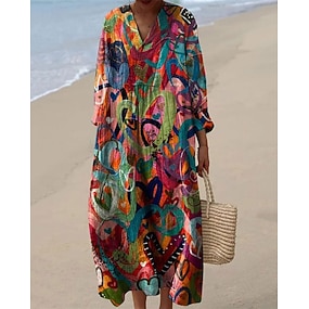 Naisten midi-mekko V-kaula-aukko pitkähiha kaftaani kevyt löysä istuvuus A-linjainen mekko rento boho ulos meneminen löysä istuvuus graafinen pitkähiha V-kaula-aukko musta sininen oranssi khaki