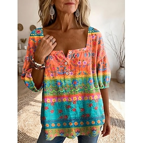 Naisten retro paita kerroksittain röyhelöhihat vintage kukkagrafiikka bohemia vintage päivittäin 3/4-pituiset hihat normaali paidat päivittäin loma lomavaatteet printti punainen sininen beige kesä