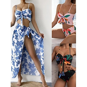 Naisten bikinit 3-osainen uimapuku hame avonaiset slim lomaranta-asut kukkakuosiset V-aukko olkaimeton uimapuku